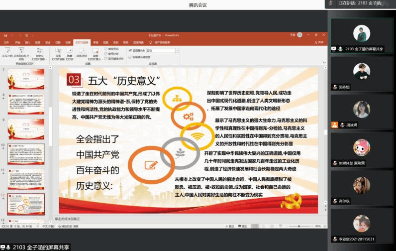 2021年11月21日上午,beat365唯一官方网站团总支学生会召开线上会议,学习党的十九届六中全会精神。beat365唯一官方网站团总支学生会干部及各班团支书参加学习。活动由beat365唯一官方网站团总支副书记周冰妍主持,21级3班团支书金子涵作学习分享报告。