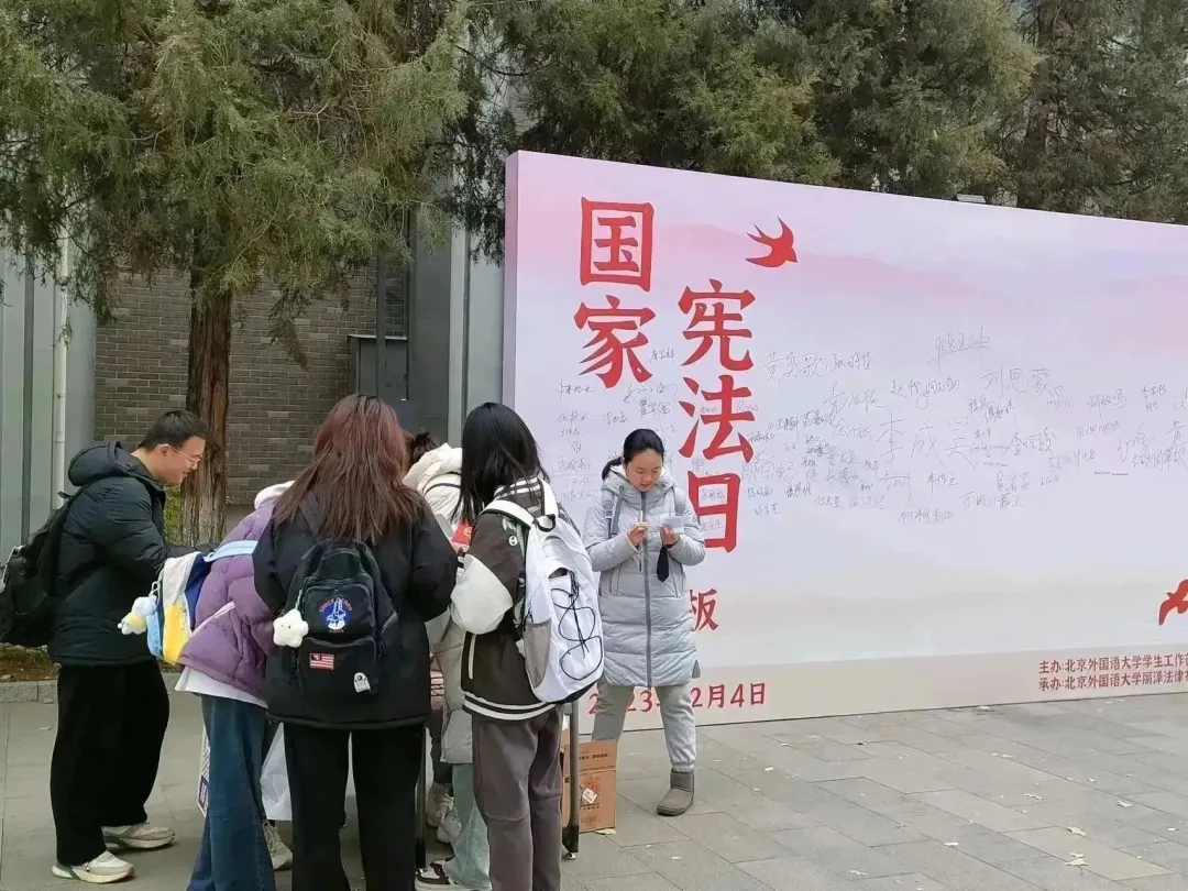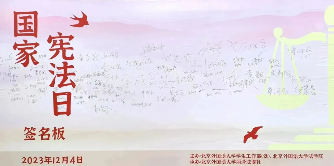 丽泽法律社在每年的十二月四日展开全方位多层次的宪法宣传活动。线下通过设置签名墙和有奖问答的方式激励学生参与。线上依托青少年普法小程序,拓宽宪法日活动参与渠道,扩大宪法日活动辐射范围。