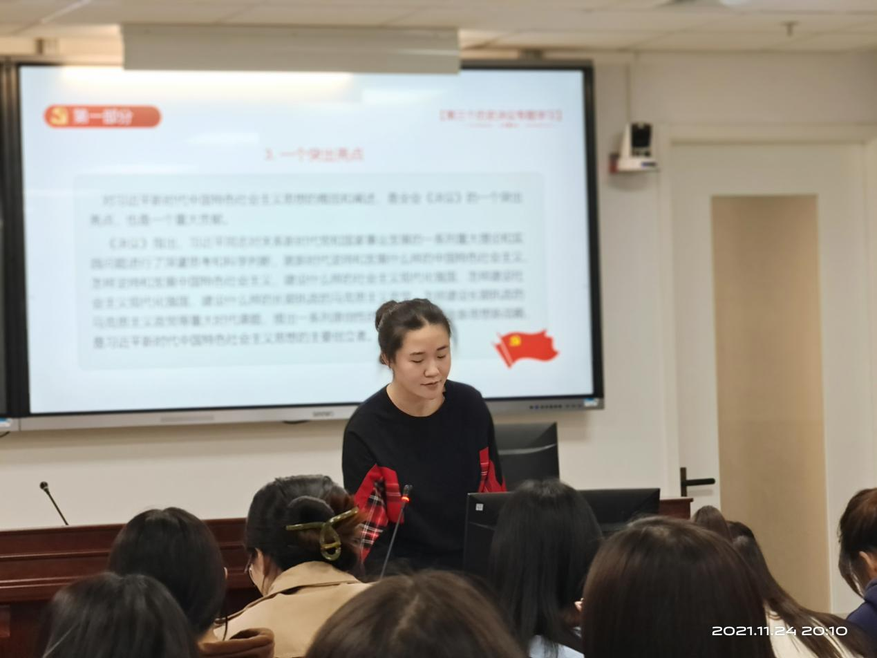 刘时剑老师传达了校党委关于深入学习贯彻党的十九届六中全会精神的工作要求。她表示,大家要进一步认识本次全会的重大意义,把对十九届六中全会精神的学习与贯彻落实习近平总书记给北外老教授们的回信精神结合起来,融会贯通、突出重点,充分利用“三会一课”、主体党日等活动,结合本专业理论实践进行深入学习。