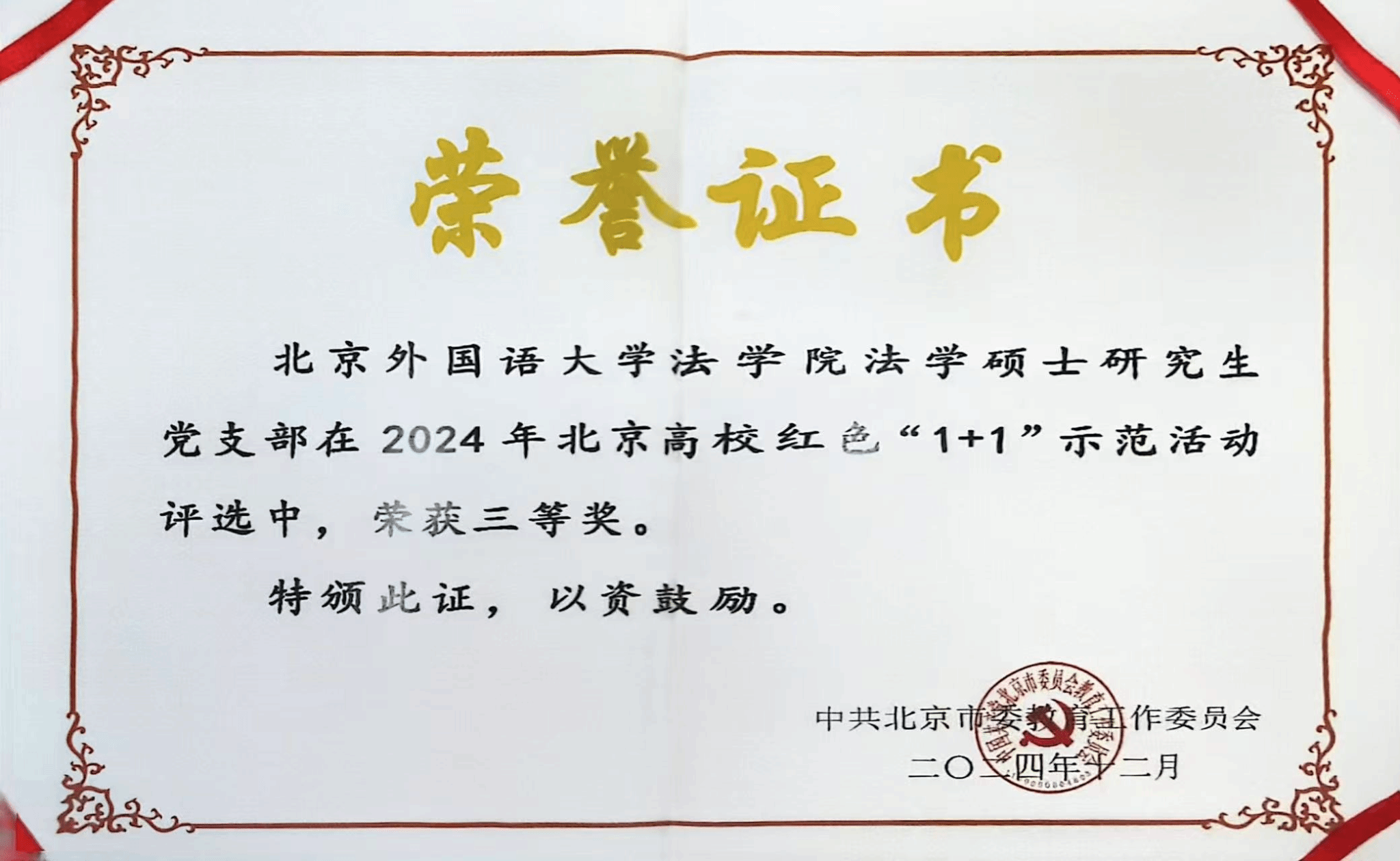 日前,中共北京市委教育工作委员会公布2024年北京高校红色“1+1”示范活动获奖名单,在我校重点支持、beat365唯一官方网站党总支悉心指导、法学硕士研究生党支部各党员共同努力下,beat365唯一官方网站法学硕士研究生党支部取得了三等奖的好成绩!