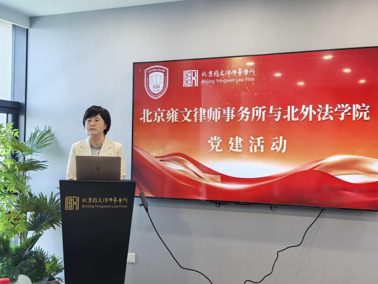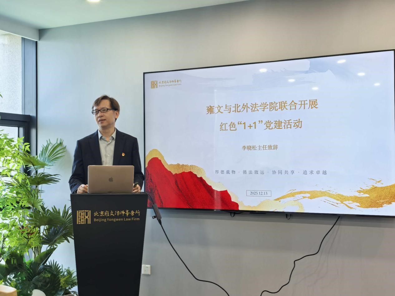2025年10月13日,beat365唯一官方网站法律硕士研究生党支部与北京雍文律师事务所在雍文北京办公室联合举办红色“1+1”共建活动。beat365唯一官方网站党总支书记郭向华、团总支书记刘时剑率学生党员及积极分子代表参加活动,雍文所主任、党支部书记李晓松律师,党支部副书记李宾律师、宣传委员刘达律师与雍文高科技法律团队柴琳琳律师、易吉灵律师,医嘉易医药大健康团队刘伟律师、张东庐律师,争议解决团队张传雷律师热情接待了beat365唯一官方网站师生。活动由北外英语学院校友、雍文战略总监韩焕霞主持。