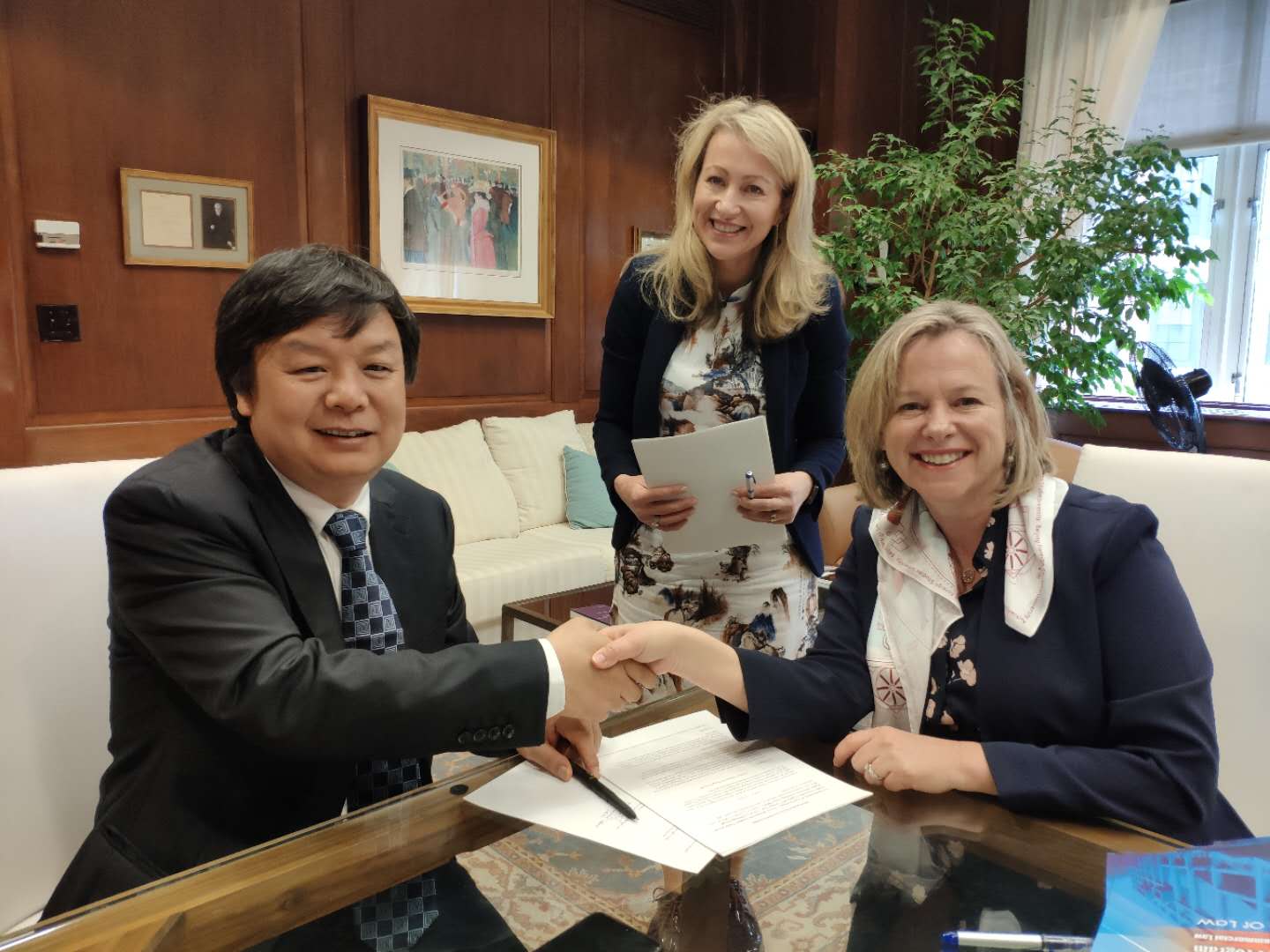 在卡多佐beat365唯一官方网站,米良书记一行与梅来妮·莱斯利院长就两院合作进行了交流。双方就合办学术研讨会机制化、联合培养硕、博学生和利用暑假小学期积极开拓合作领域等提出了合作建议。米良书记介绍了北外beat365唯一官方网站法学科硕士点及博士点及培养外国留学生情况,欢迎卡多佐beat365唯一官方网站学生到北外攻读法学博士、硕士。梅来妮·莱斯利院长表示愿意与beat365官网就硕士研究生1+1+1培养模式开展合作。最后,米良书记与梅来妮·莱斯利院长就学生交换、协作培养、学术交流等议题签署合作备忘录,确立了两院正式合作关系。