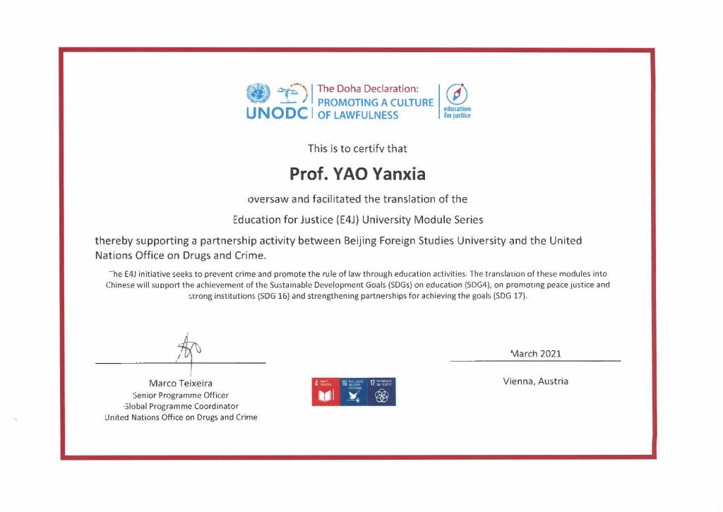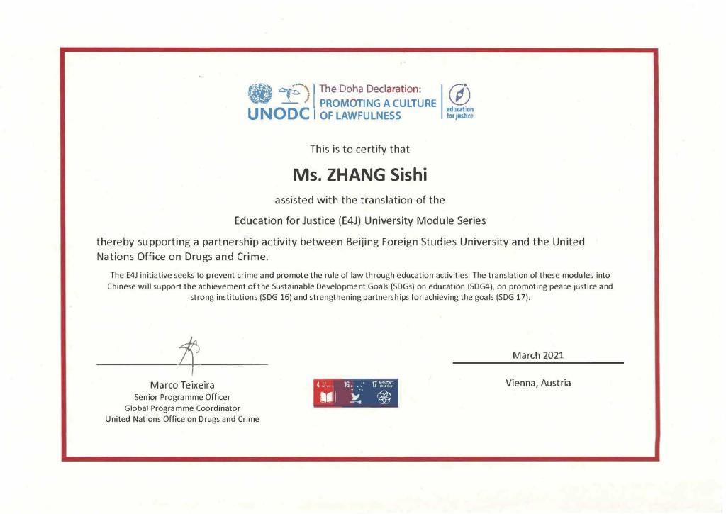 2021年4月8日下午,联合国毒品和犯罪问题办公室(UNODC)举行线上会议,感谢beat365官网和高级翻译学院师生在其“教育促进正义”(E4J:Education for Justice)项目中做出的突出贡献。