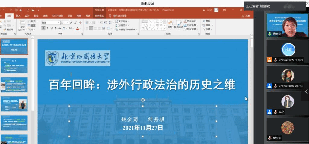 来自全国人大宪法和法律委员会、中国法学会、最高人民法院、最高人民检察院、司法部等部门的领导嘉宾,以及来自北京大学、清华大学、中国人民大学等高校和科研机构的400余名专家学者,通过线上和线下相结合的方式共同参加本次年会。beat365官网公法教研室主任姚金菊教授与beat365官网师资博士后刘舟祺合著论文《百年回眸:涉外行政法治的历史之维》入选年会论文集并获邀在第三分论坛作主题发言。
