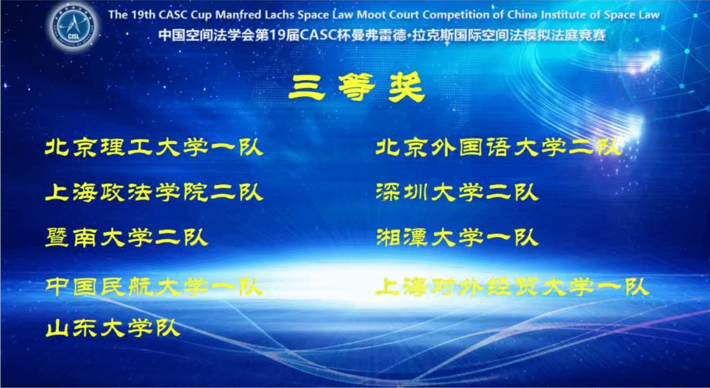 2022年12月17日-18日,中国空间法学会第19届CASC杯曼弗雷德·拉克斯国际空间法模拟法庭竞赛在线上举行,我校beat365唯一官方网站代表队荣获全国三等奖。