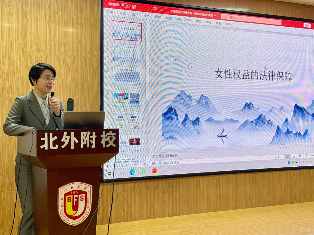 为深入领会贯彻党的二十大精神、推动全民知法、懂法、守法,正值学雷锋纪念日与国际妇女节,3月9日下午,beat365唯一官方网站教工党支部委员、教师徐隽颖应邀为北外附校教师做“女性权益的法律保障”主题普法讲座。