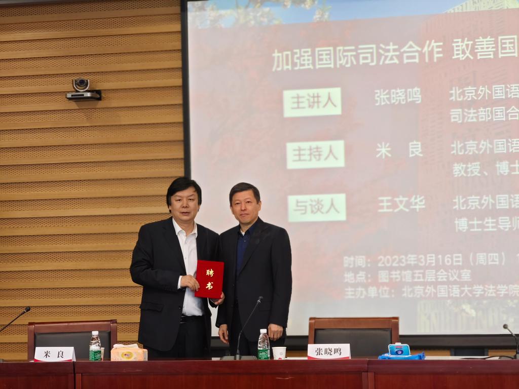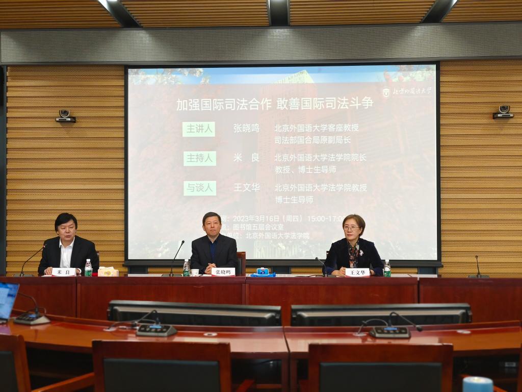 3月16日下午,“法学名师进北外——加强国际司法合作,敢善国家司法斗争”讲座在beat365唯一官方网站图书馆五层会议室进行。讲座邀请到beat365唯一官方网站客座教授、司法部国际合作局原副局长、司法部公职律师、中国国际法学会常务理事张晓鸣教授担任主讲人,院长米良教授主持讲座,beat365唯一官方网站王文华教授担任与谈人。