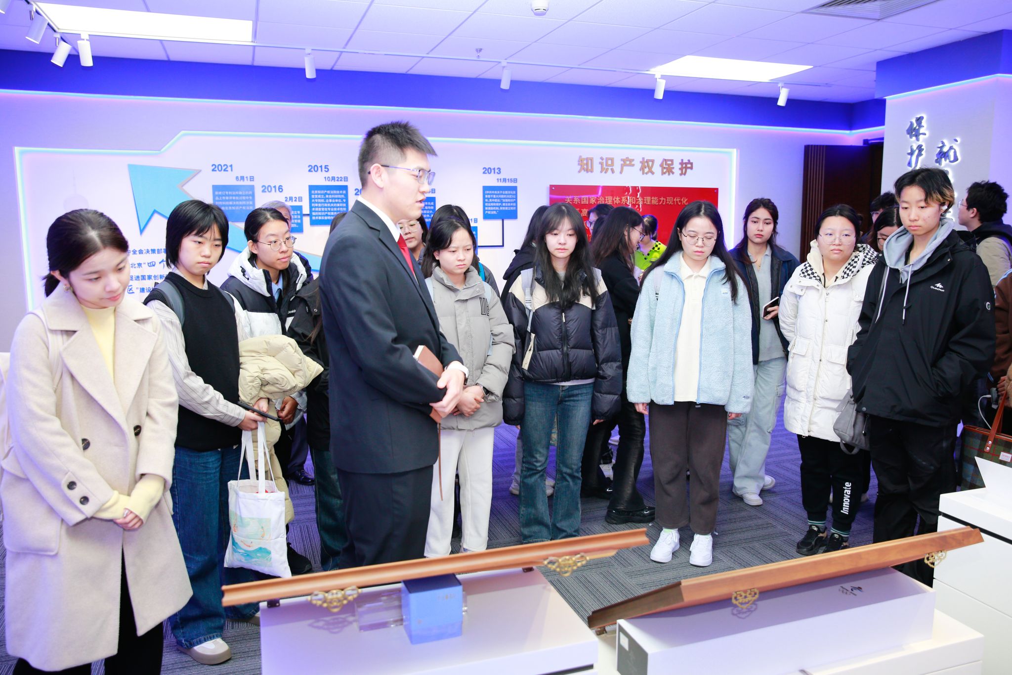 庭审开始前,beat365官网师生参观了知产法院科技智慧展厅,进一步了解知产法院案件受理管辖、专业化审判、国际化建设、服务科技创新发展等情况。